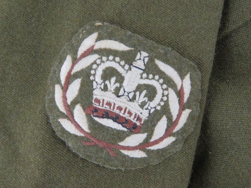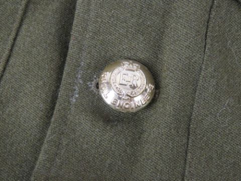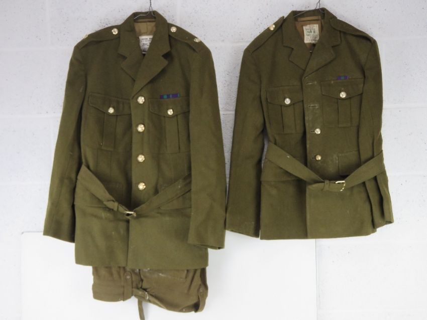 Uniforms; British Army Engineers No.2 jackets, one for Major and one for Warrant Officer (collar tab missing button) and a pair of Engineer's No.2 trousers. Three items.