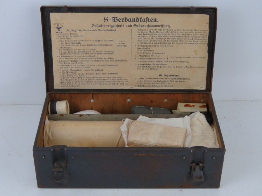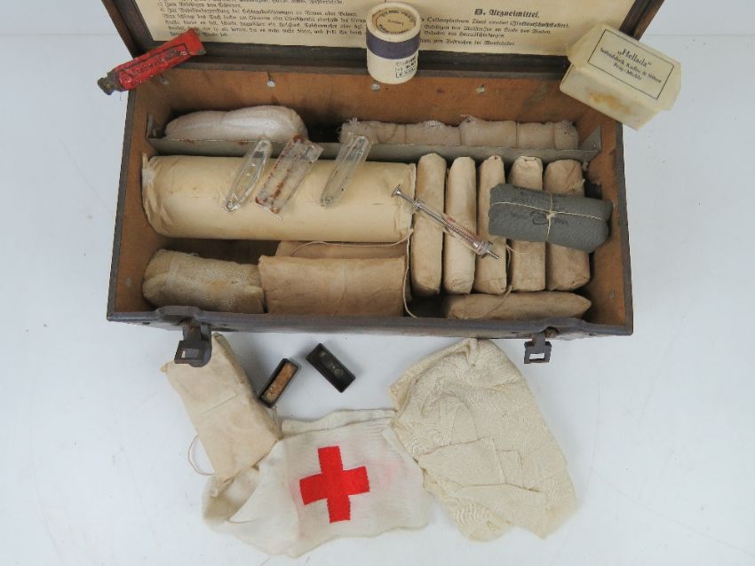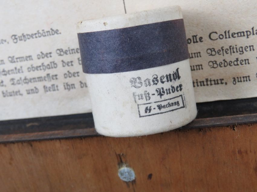 A WWII German medical kit having medical accessories within inc; foot powder, medical arm band, bandages, pins etc, has a contents list dated 1939.