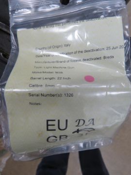 A deactivated Breda M38 7.92mm tank heavy nachine gun with wartime Italian military marks upon. With moving bolt (under spring pressure), moving trigger and safety, bolt release, opening top cover, and removable magazine. Sn- 1326. With EU certificate.