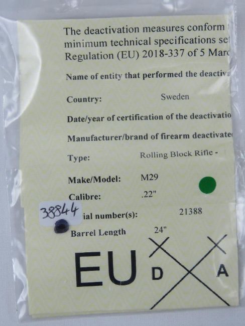 A deactivated Swedish M29 Rolling Block .22LR Calibre rifle, moving trigger and breach block, non firing action.ST-38844-SN-21388. With EU certificate.