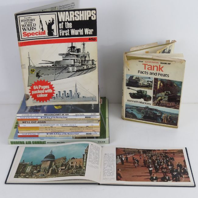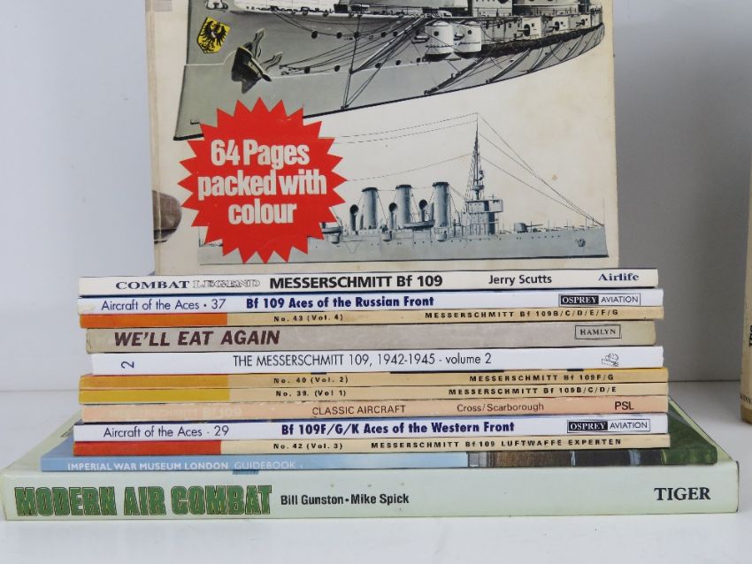 A quantity of assorted military themed books inc: 'Messerschitt bf109', 'We'll Eat Again', 'Tank Facts and Feats', 'Modern Air Combat', 'War Ships of First World War' etc. Fifteen items.