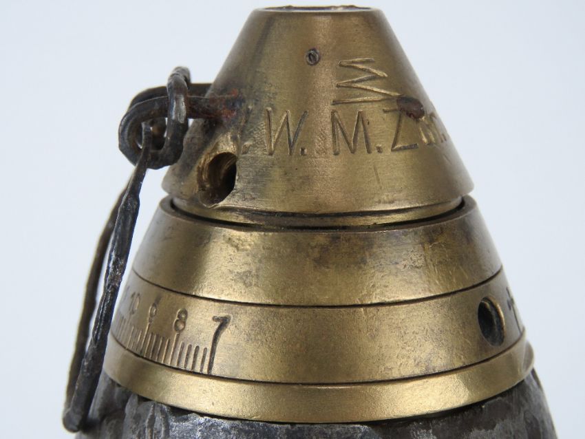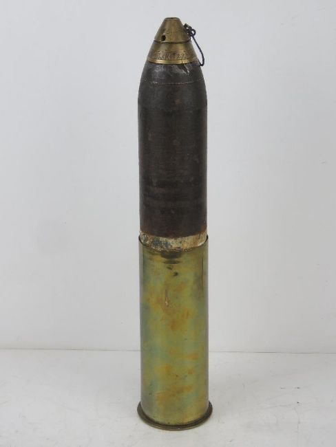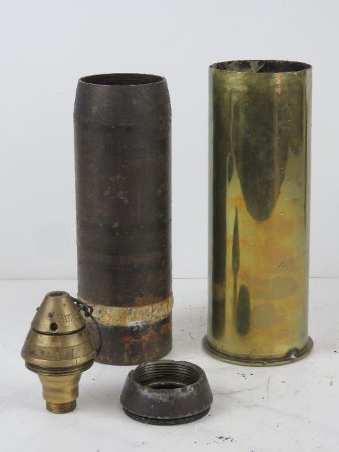 An inert WWI 76mm Minewaffer in 77mm shell, dated 1917 casing with 1917 dated fuse. All standing 48cm high.