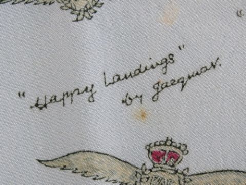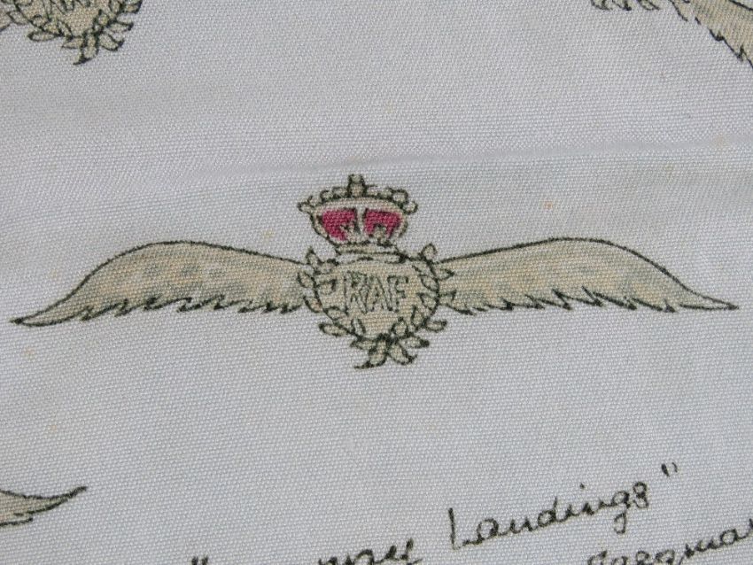 A rare WWII Jacqmar scarf 'Happy Landings' with Winston Churchill quotes and RAF wings upon, measuring approx 90 x 78cm.