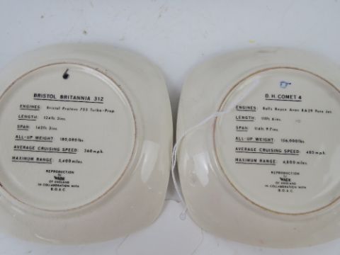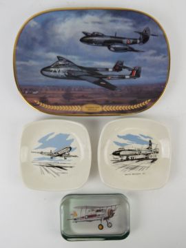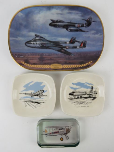 A limited edition Bradford Exchange decorative plate featuring The Vampire and Meteor Aeroplanes from The Sky's the Limit Collection. Together with two reproduction Wade decorative pin dishes featuring the Bristol Britannia and the D8 Comet. Also a glass paperweight having aviation theme. Four items.