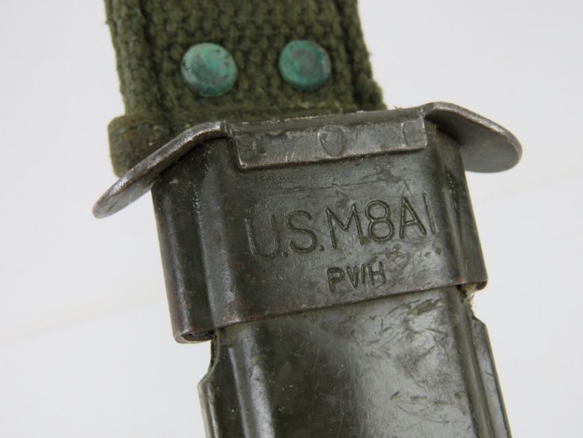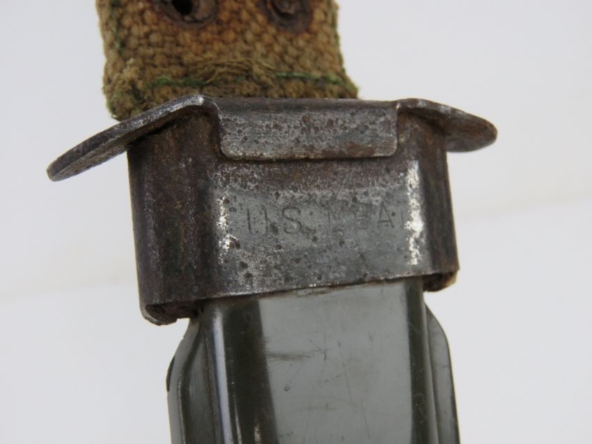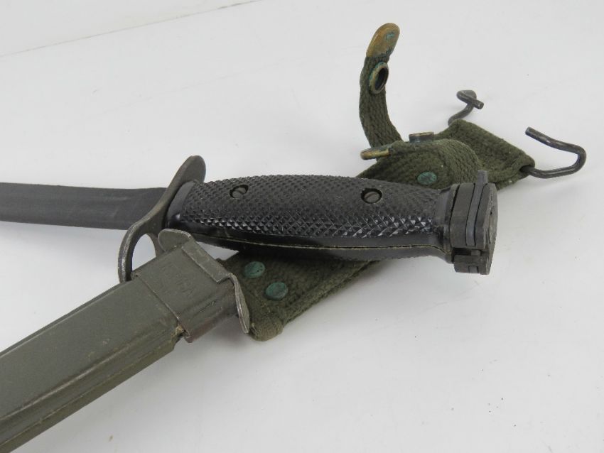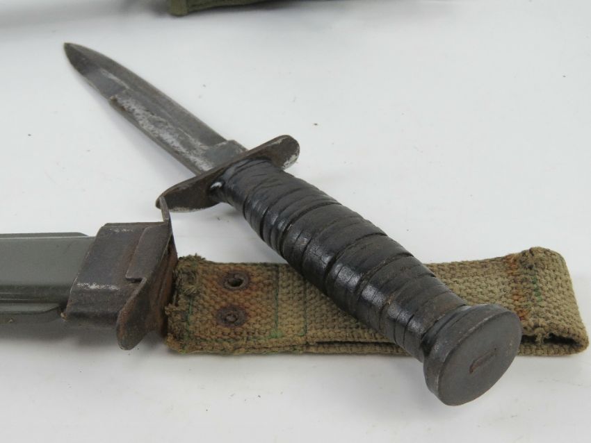 A US M16 bayonet with scabbard. Together with a US fighting knife with scabbard. Two items.