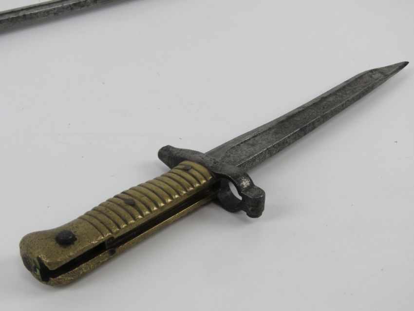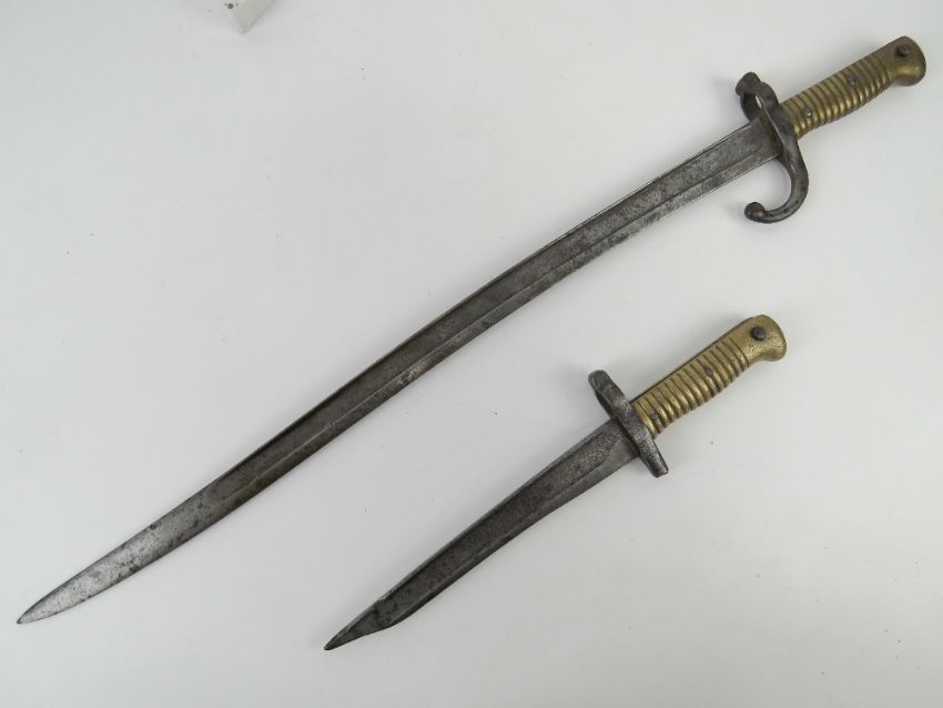 A French Chassepot 1866 pattern bayonet, together with a converted 1866 fighting knife. Two items.