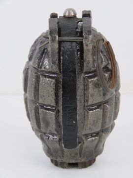 An inert WWI Mills No.36 grenade having cut away section for display, with spoon and pin.