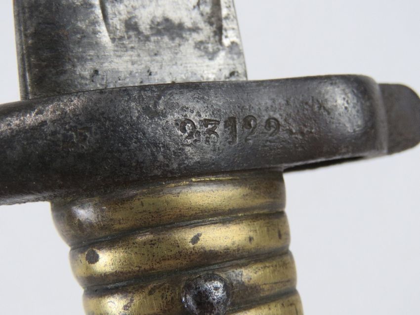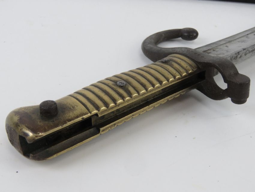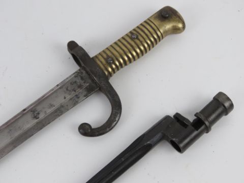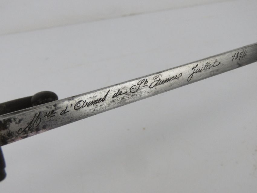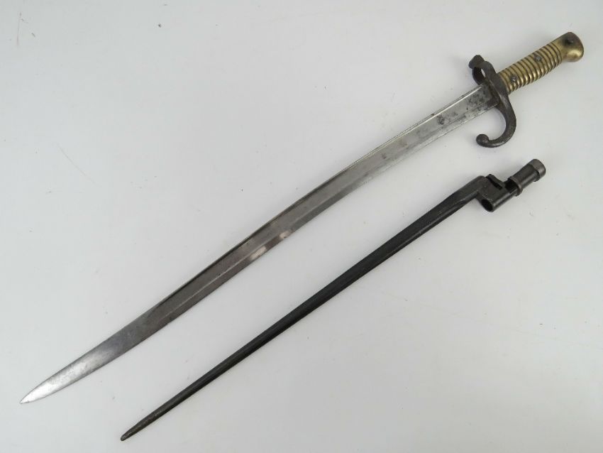 A French Chassepot 1866 pattern sword engraved ""Mre d' Armes de St. Etienne Juillet 1874"" to the spine. Together with a Mosin Nagant bayonet. Two items.