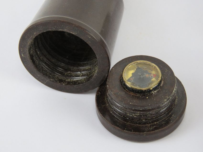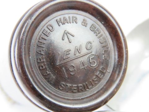 A WWII British Forces and RAF escape and evasion (E&E) razor wash set in tin, the brush is dated 1945, inside the brush is a compass. Made by MI9 for use if made a POW.