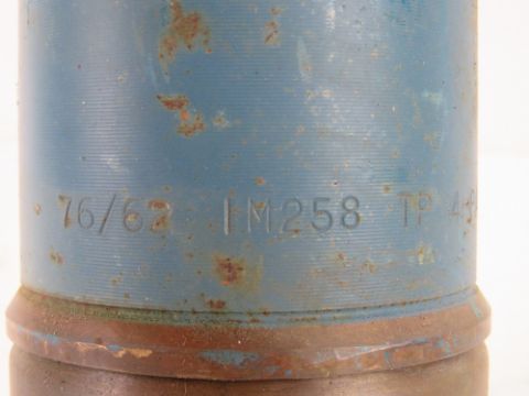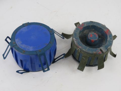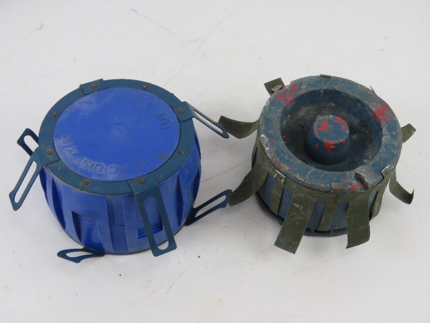 An inert British 76mm Malara Naval TP MOD79 cannon projectile with dummy fuse. Together with an inert French F1 Scatterable Practice Mine, and an inert US M131 training mine. Three items.