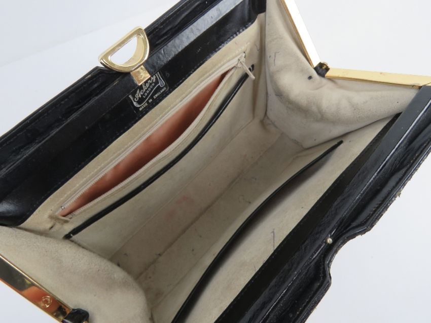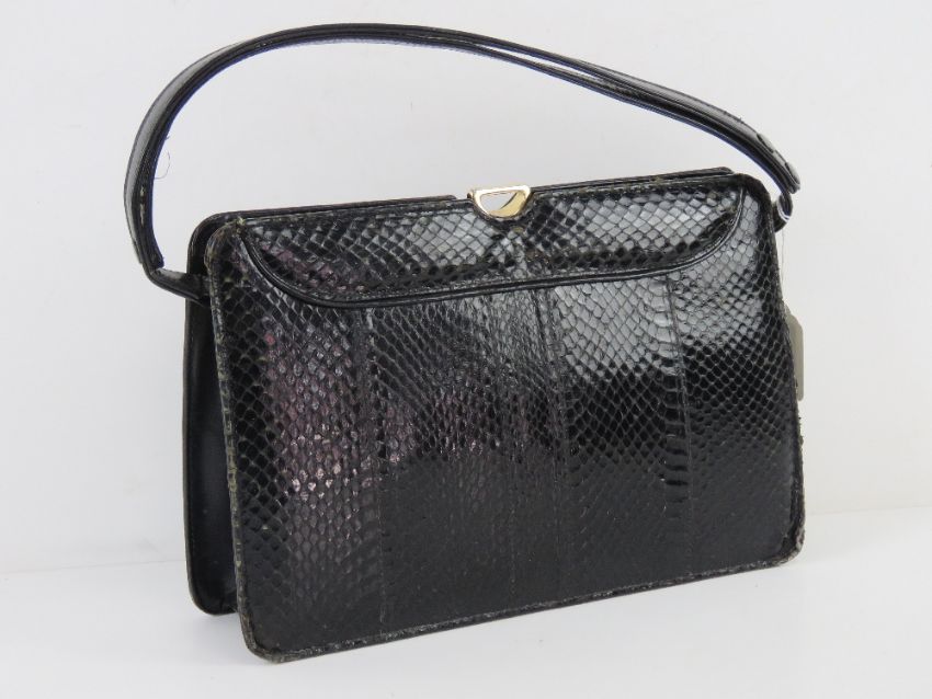 A vintage black leather reptile skin handbag bearing label Ackery London, suede lining, slightly a/f (pen marks noted) approx measurements 28.5cm wide, 19cm high.
