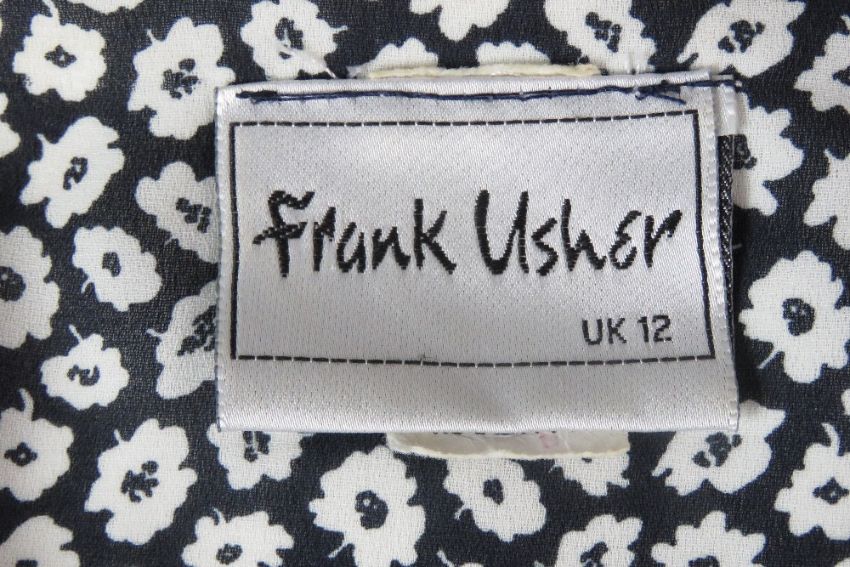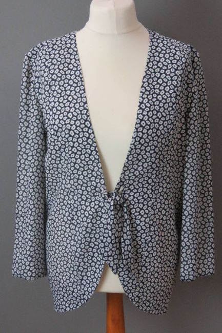 Frank Usher; a light floral jacket having tie waist in navy and white, UK size 12. Approx measurements; 42" chest, 30 1/2" length at back, 16 1/2" sleeve length underarm.