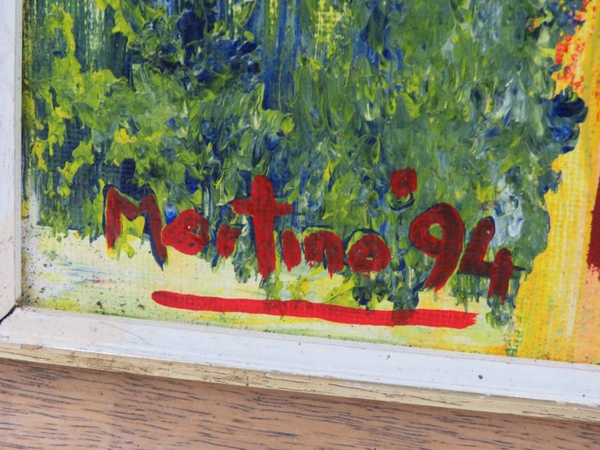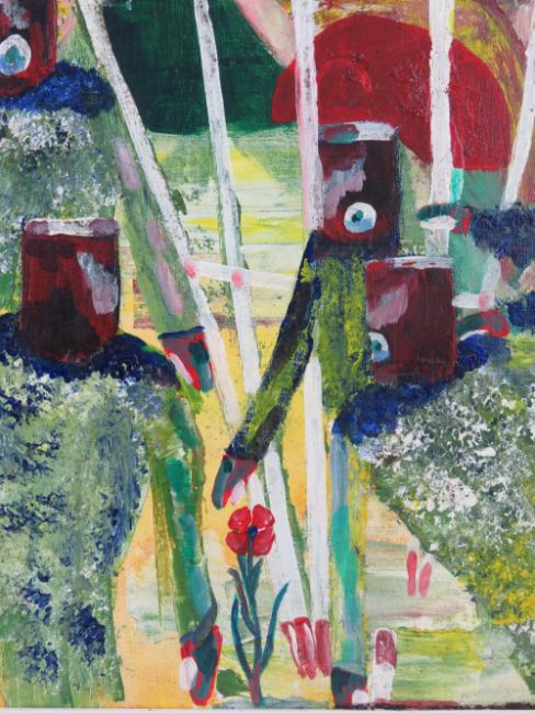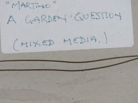 Mixed media by Martino; titled 'A Garden Question' being abstract Cubist influence crowd around a flower. 60 x 50cm, framed.