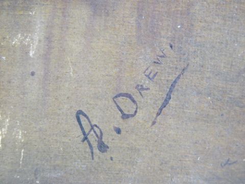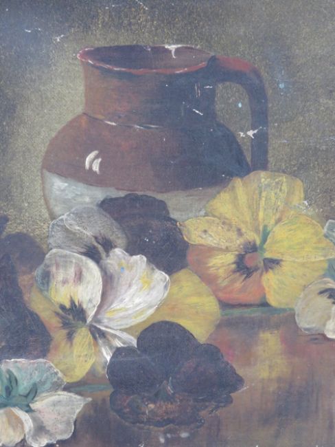 Oil on canvas; pansies before a stoneware jug, signed lower right A. Drew, a/f, 35.5 x 20.5cm.