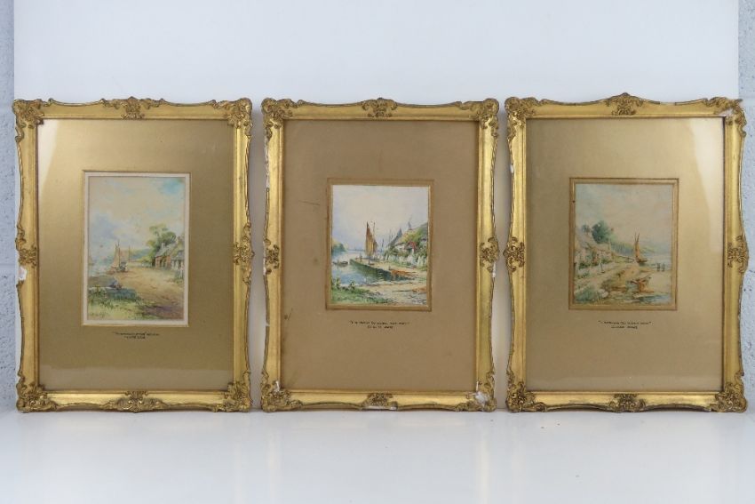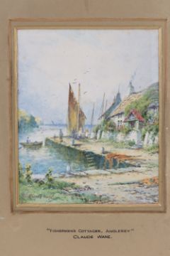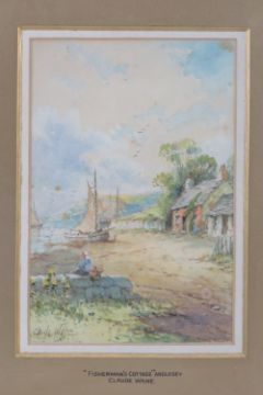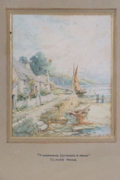 A set of three watercolours by Claude Wane, entitled 'Fisherman's Cottage Anglesey' and Fishermen's Cottages Anglesey' and 'Fishermen's Cottages N.Wales'. Each measuring 16.5 x 13cm having gilt mounting slip and slightly a/f gilt frame, one glass deficient.