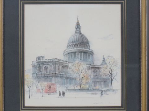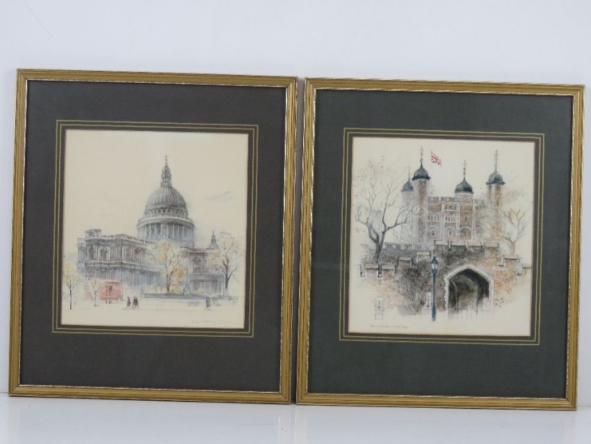 A pair of coloured prints of London being St Paul's Cathedral and Tower of London, each 22 x 21cm, framed and mounted.
