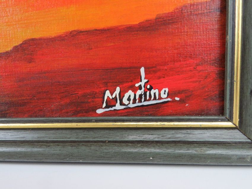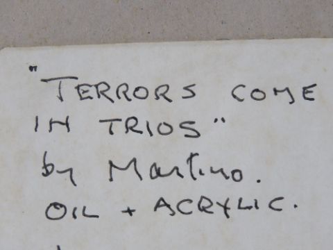 Oil and acrylic by Martino entitled 'Terrors come in Trios' harbour scene in moonlight with fishermen before and sailboats beyond, 60 x 50cm, framed.