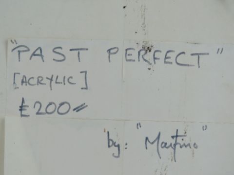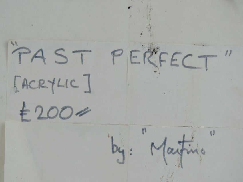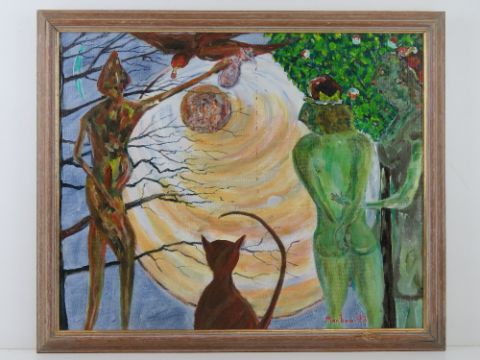 Acrylic by Martino entitled 'Past Perfect', being abstract of two nude green females with central cat 54 x 44cm, framed.