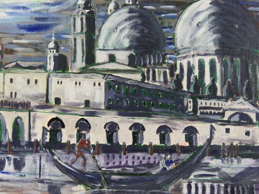 Oil and acrylic by Martino being a Venetian canal scene in moonlight having gondolier with domed buildings beyond, 60 x 45cm, framed.