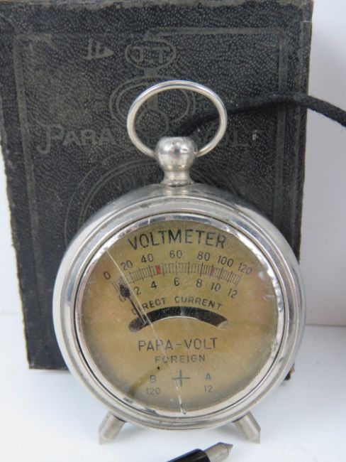 A Para-Volt voltmeter in original box. Together with a silver plated desk clock having Quartz movement and an aneroid barometer with thermometer. Three items.