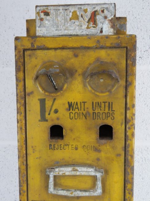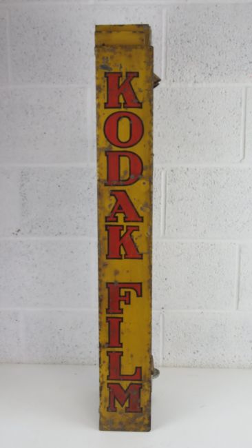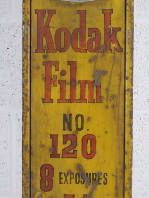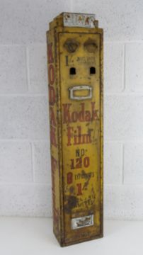 A rare original Kodak Film dispenser, bearing Kodak Film to each side and to the front 'Kodak Film No 120. 8 Exposures 1/.' with drawer under. Painted aluminium wall mounted exterior dispenser c1950/60s. 21 x 13 x 97cm. Key deficient.