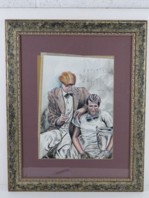 Watercolour study of Mike Hawthorn and Peter Collins in their only victory together in the Supercortemaggiore 100kms race at Monza, 40 x 28cm. Framed and mounted. Prov: From the collection of a prominent member of the Guild of Motoring Writers.