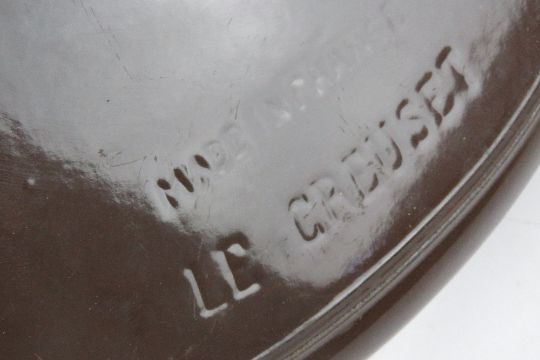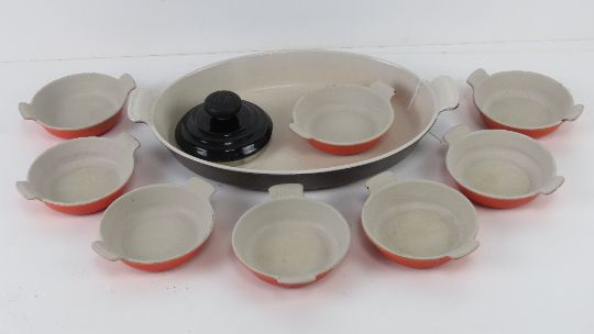 Le Cruset; a large oval oven dish together with a set of eight individual dishes and a teapot lid.
