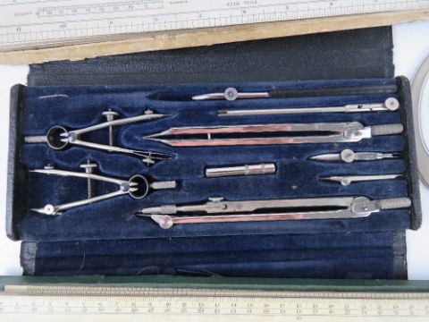 A John Rabone & Sons hundred foot tape measure together with a quantity of assorted cardboard scales, set of compasses and other assorted draftsman's items.