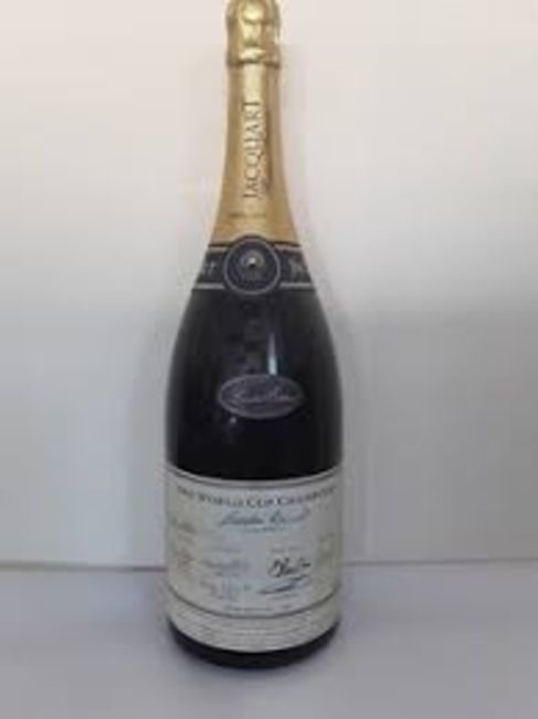 A rare commemorative Jacquart Reims (France) limited edition World Cup Magnum of champagne, bearing signatures (facsimile) for eight of the 1966 winning team, bottle number 0281 of 1966, signatures include; Bobby Charlton, Nobby Stiles, Geoff Hurst, Gordon Banks, George Cohen, Ray Wilson, Martin Peters and Alan Ball. Standing 38cm high.