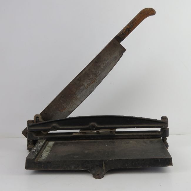 A vintage hinged paper guillotine on cast metal base, c1950s.