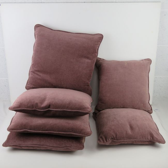 A set of six purple velvet cushions, four large, two small, with liner.