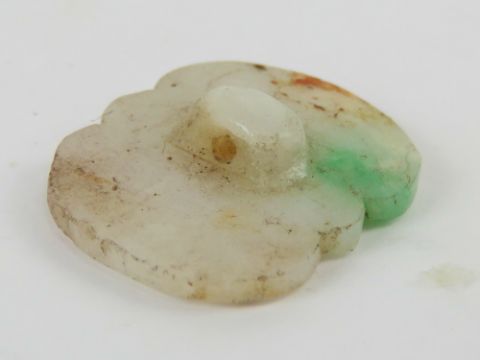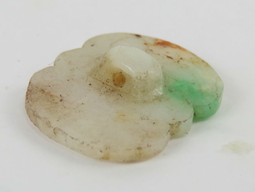 A single jade button 'mutton fat' white with green fleck carved in the form of a rams head, 1.7cm wide.