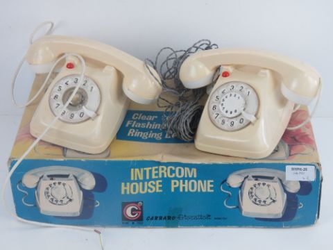 A Carraru Intercom house phone with 'clear tone, flashing light and ringing bell!', together with another boxed telephone intercommunication set 'with signal bulb'. Two items.
