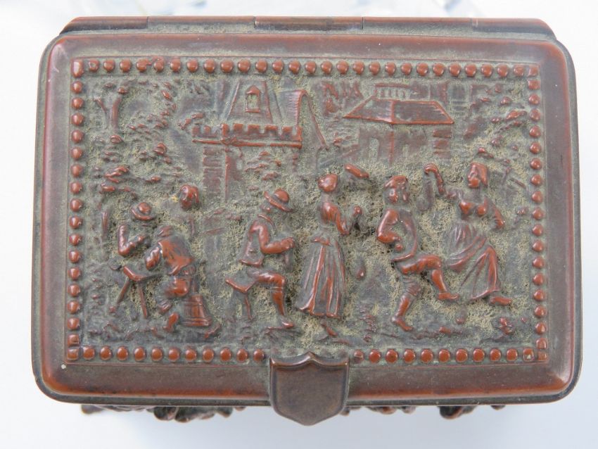 An HM silver and cut glass salt, together with three other salts (2+1) and a lidded relief jewellery casket (one foot deficient). Five items.