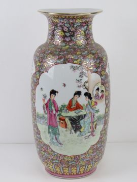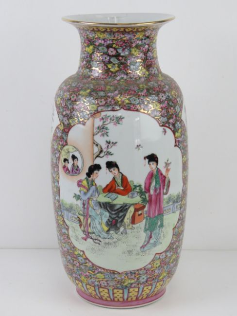 A large Chinese shoulder vase having female figures upon with pink and blue floral decoration and standing 44cm high.