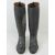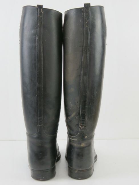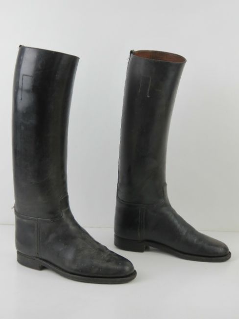 A pair of black leather riding boots, having interior finger pulls, Horace Batten three sectional trees (one a/f), 11'' heel to toe.