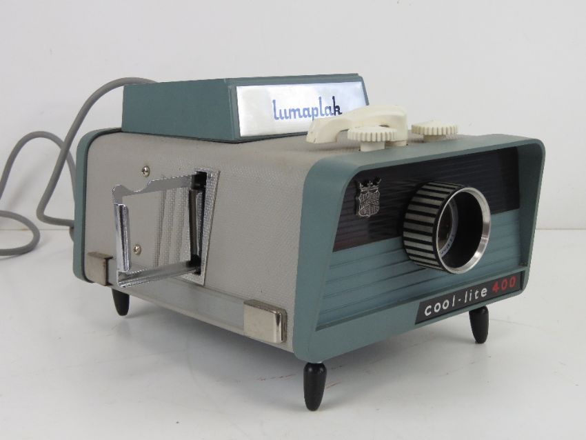A Lumaplak Maxilite 300 Cool-lite 400 slide projector in 'as new' condition in case, with instructions and promotional shop price card. Case measuring 30 x 28 x 18cm. NB having original bayonet power fitting - For rewiring.