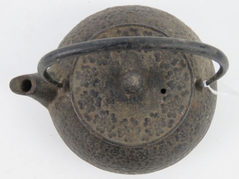 An oriental cast iron teapot having raised floral decoration upon, swing handle, oriental marks to base, approx 14cm dia, approx 15.5cm high.