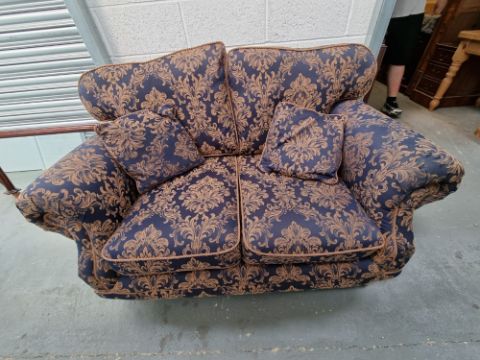 A two seater settee having scroll arms and upholstered in blue and gold fabric, loose cushions, all over brass castors, approx 105 x 53 x 85cm.