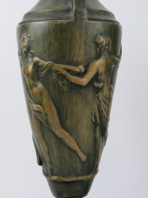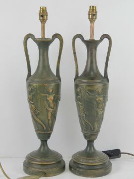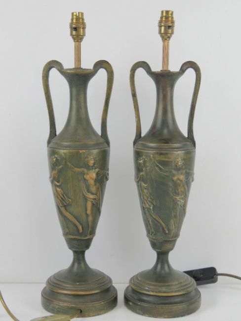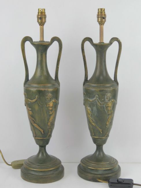 A pair of large classical style table lamps in the form of Grecian urns, having Bacchus decoration upon, each standing 57cm high inc fitting.