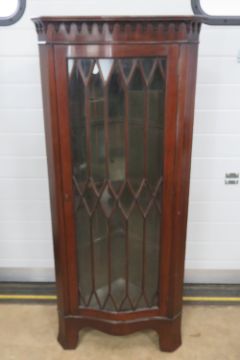 A 20th century astral glazed freestanding corner cabinet in mahogany, glazed door opening to reveal shelves within.