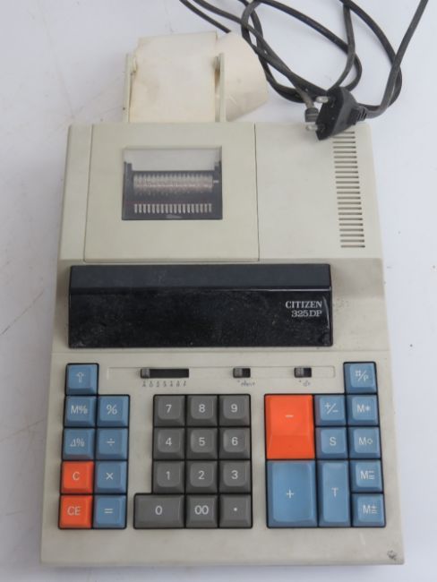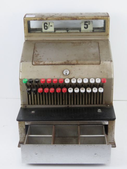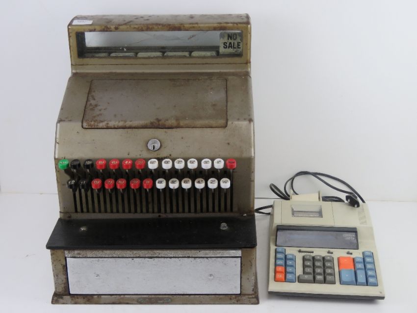 A vintage c1960s shop till, pre-decimalisation, with 'ting-ting' bell and spring loaded drawer under, 37 x 40 x 44cm. Very heavy! Together with a Citizen 325DP electric adding machine.