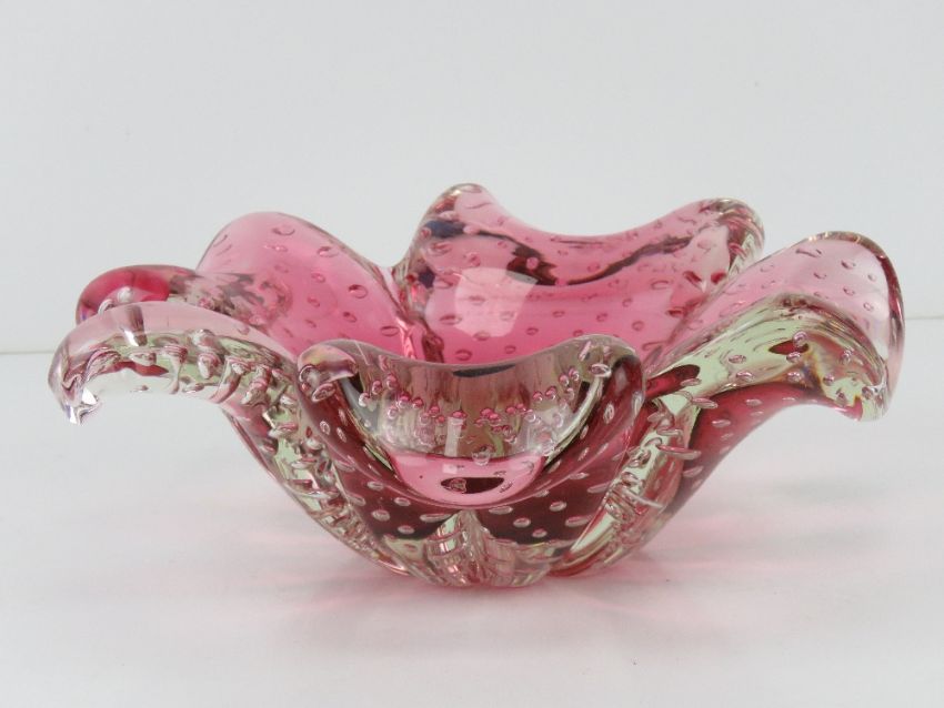 An art glass bowl in the form of a four leave clover, pink ground, having bubble pattern throughout. 24cm wide.