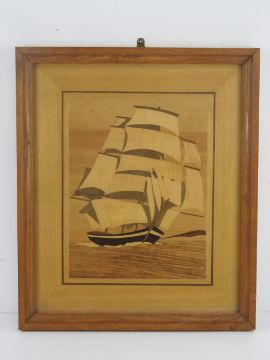 A large marquetry picture of a masted ship with sails on the sea, framed and glazed, overall size 42.5 x 50cm.