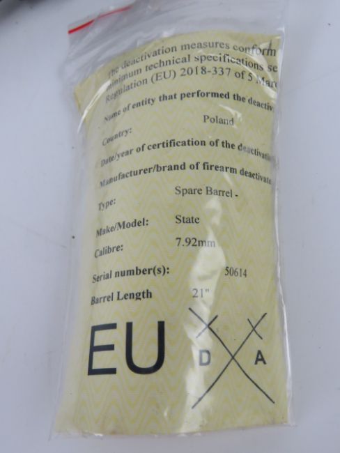 A deactivated MG53 spare barrel, 7.92, with EU certificate.