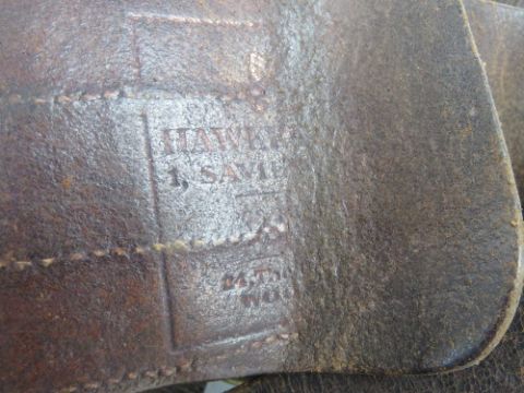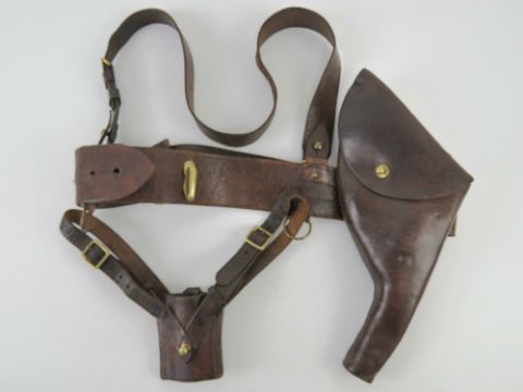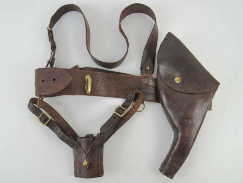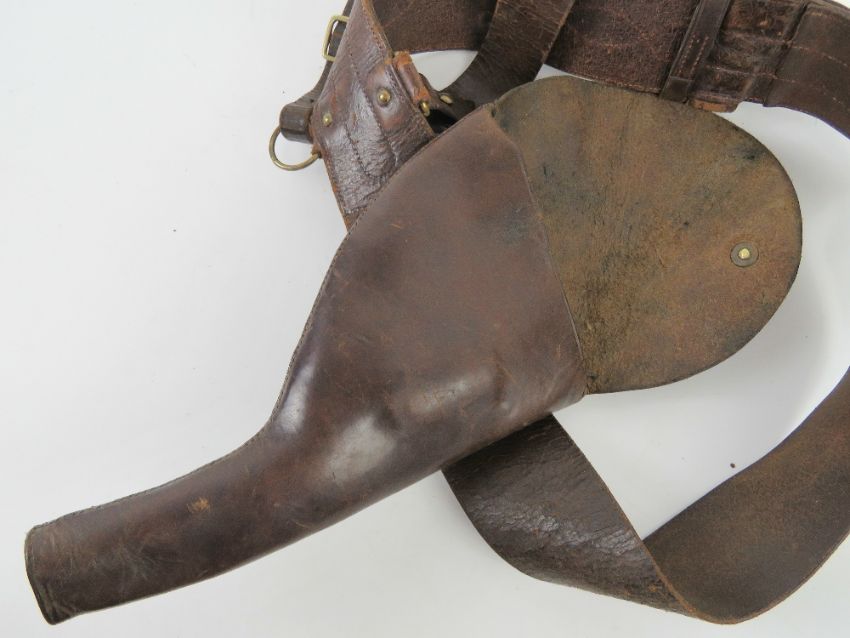 A WWI British Webley Mk6 holster on sand brown belt, with sword frog.