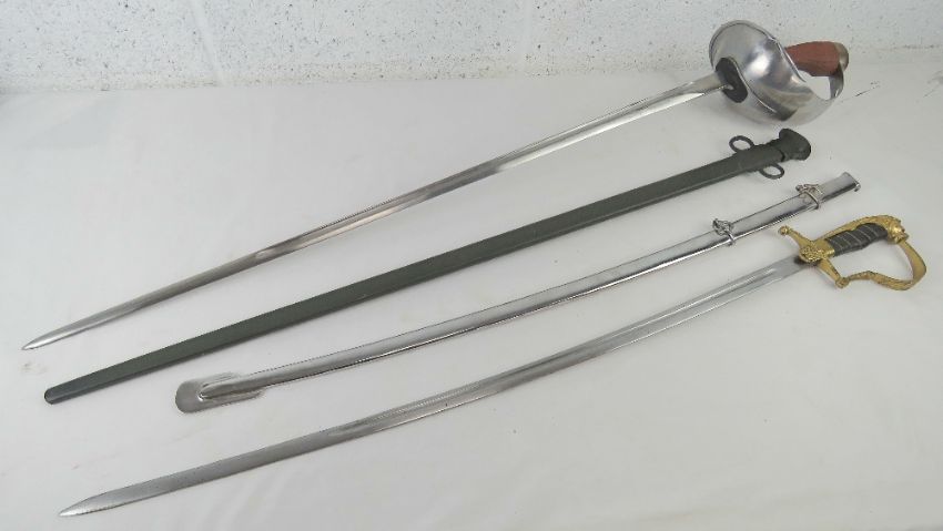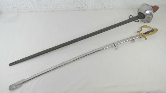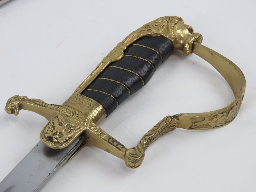 Two reproduction swords; British Cavalry and German with Lions head design, each with scabbard.