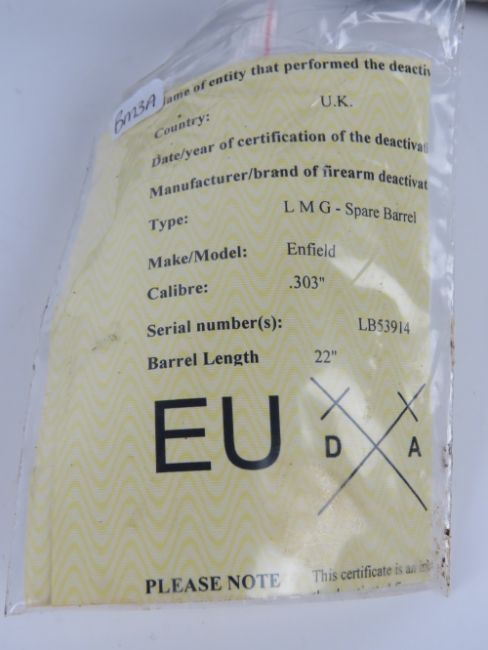 A deactivated Bren MKIII Barrel with carry handle. With EU certificate.