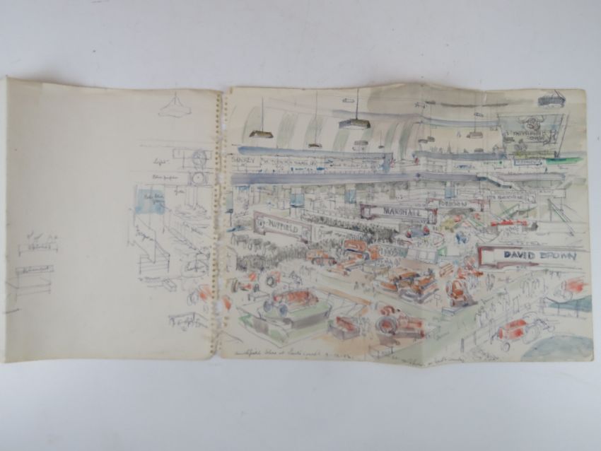 Oil on board, 'The Farmer's Own Christmas Show'. Study of the Smithfield Show of 1956, painted for The Holly Leaves Magazine 1957 by Max Hofler. Board measuring 50 x 75cm. Together with artist's original watercolour sketch and facsimile copy from the Holly Leaves Magazine PP28/9 (1957) a superlative study of this agricultural icon in his heyday, Ferguson, Fordson, Nuffield, Marshall and David Brown stands, together with livestock etc.