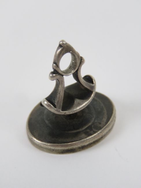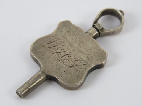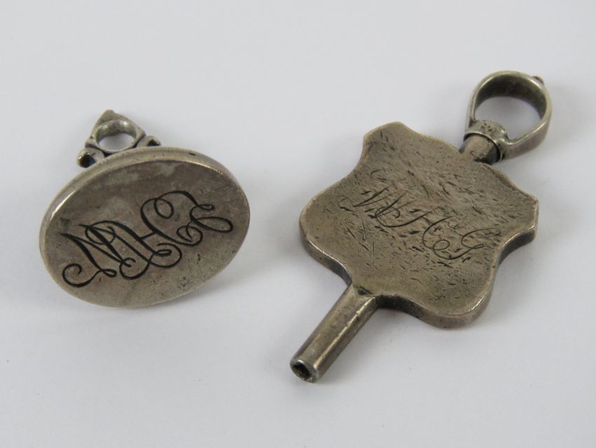 A white metal seal having indistinct hallmarks upon together with a white metal watch key, no apparent hallmarks, each bearing WHG monogram, total weight 29.3g.